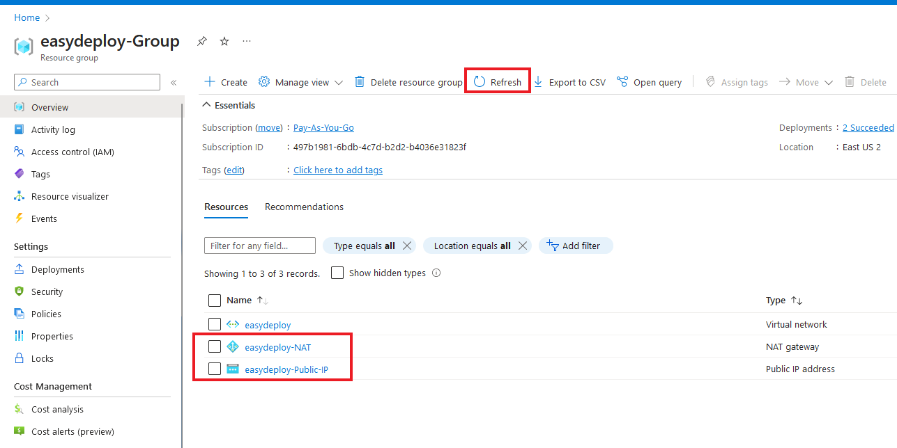 Once the Terraform apply is completed, navigate into the Azure console and select your resource group and click refresh. Now you will see the created Nat gateway with the public IP.